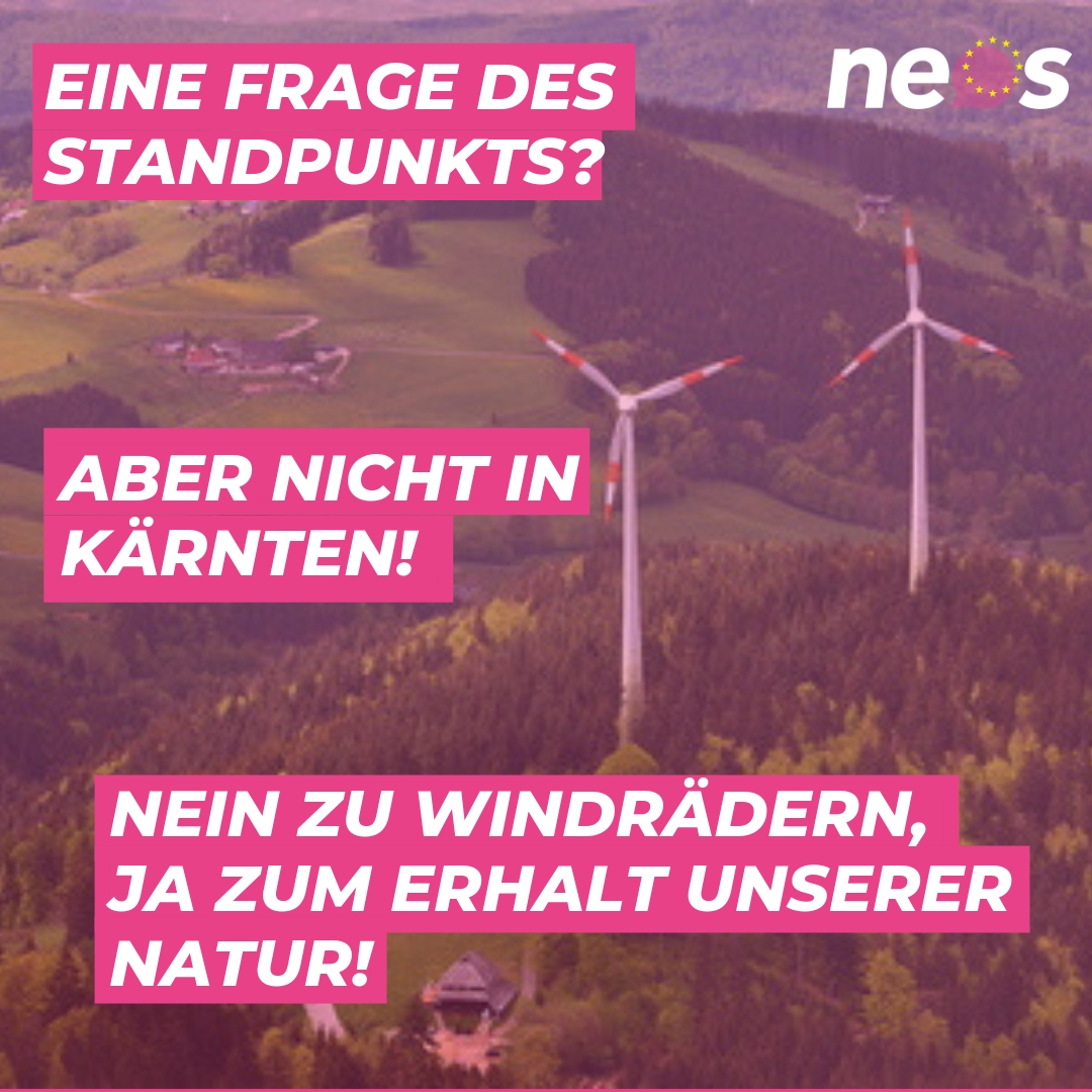 Eine so gravierende Veränderung des Landschaftsbildes ist für NEOS Kärnten nicht akzeptabel. Auch muss man Alternativenergie nicht erzwingen, wenn die Landschaft dafür nicht gemacht ist. Nach dem Vorbild von Südtirol, Vorarlberg und Tirol soll Kärnten auf Windräder verzichten. Diese Bundesländer haben auch aus touristischen Gründen den Windrädern ein klares „Nein“ gegeben.
