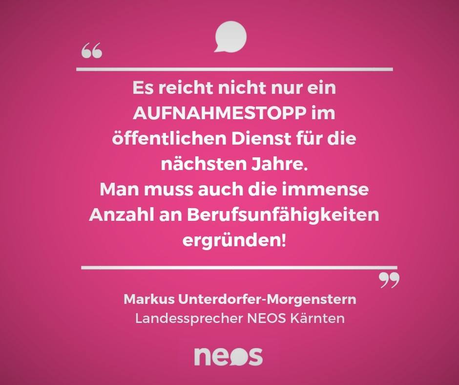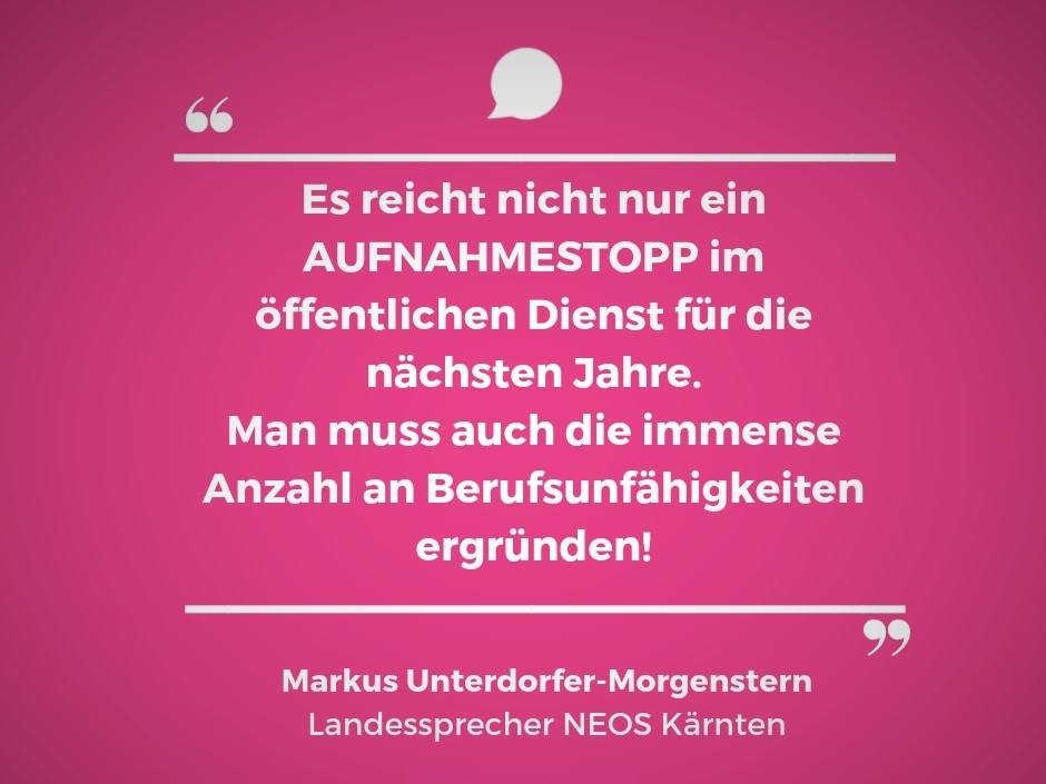 „Dieser Durchschnitt liegt deutlich unter den gesetzlichen 65 Jahren. Durch diese Ruhestandswelle sind die Kosten für Pensionsausgaben laut Rechnungshof damit um 14,4 % angestiegen. Der Rechnungshof empfiehlt eine Überprüfung der vielen krankheitsbedingten vorzeitigen Ruhestände“, fasst Markus Unterdorfer-Morgenstern, NEOS Landessprecher, die Situation zusammen. „Es reicht nicht nur ein Aufnahmestopp im öffentlichen Dienst für die nächsten Jahre. Man muss auch kontrollieren, worin der Grund für die immense Anzahl an Berufsunfähigkeiten liegt.“